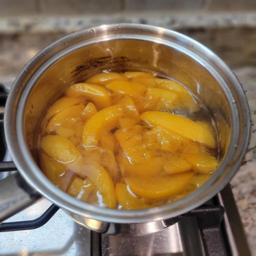 Over here on the stove we have the pickled peaches simmering away in their saucepan.