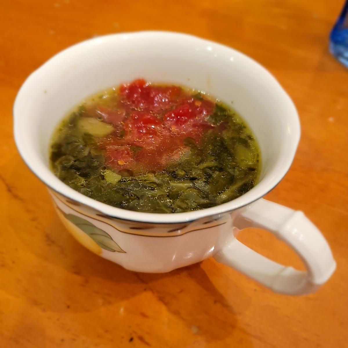 In all seriousness, though, I’ve discovered that greens aren’t so bad as they sound! Although I still can’t claim to like the lettucy stuff and broth by itself (some people in my family slurp it with great enjoyment), if you combine them with the sweet candied tomatoes they aren’t half bad. In fact, they’re rather good (But mind you keep the ratio of red to green well balanced, or else…).