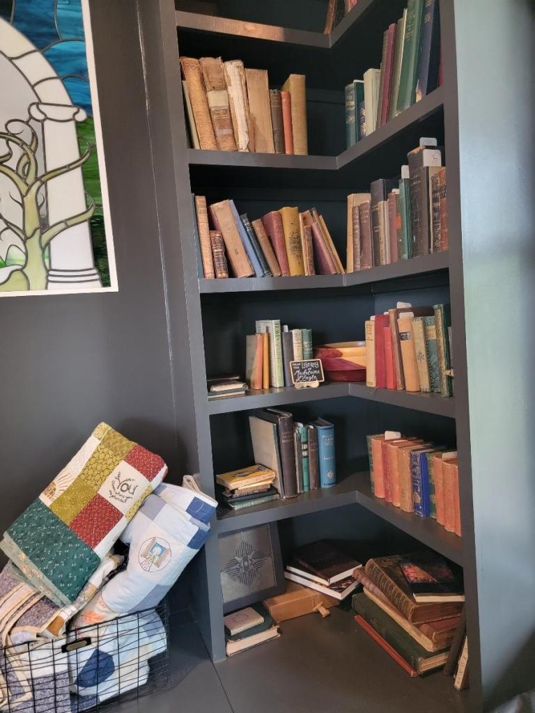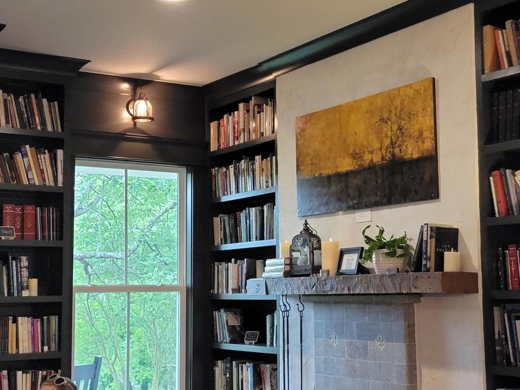 There are many wonderful details around the Manor. When you walk up a steep set of stairs to the porch and through the front door you will enter an open room. Straight in front of you is a wide space of couches and chairs. There are books scattered about over the end tables and coffee tables, and a hidden reading room behind a bookshelf.