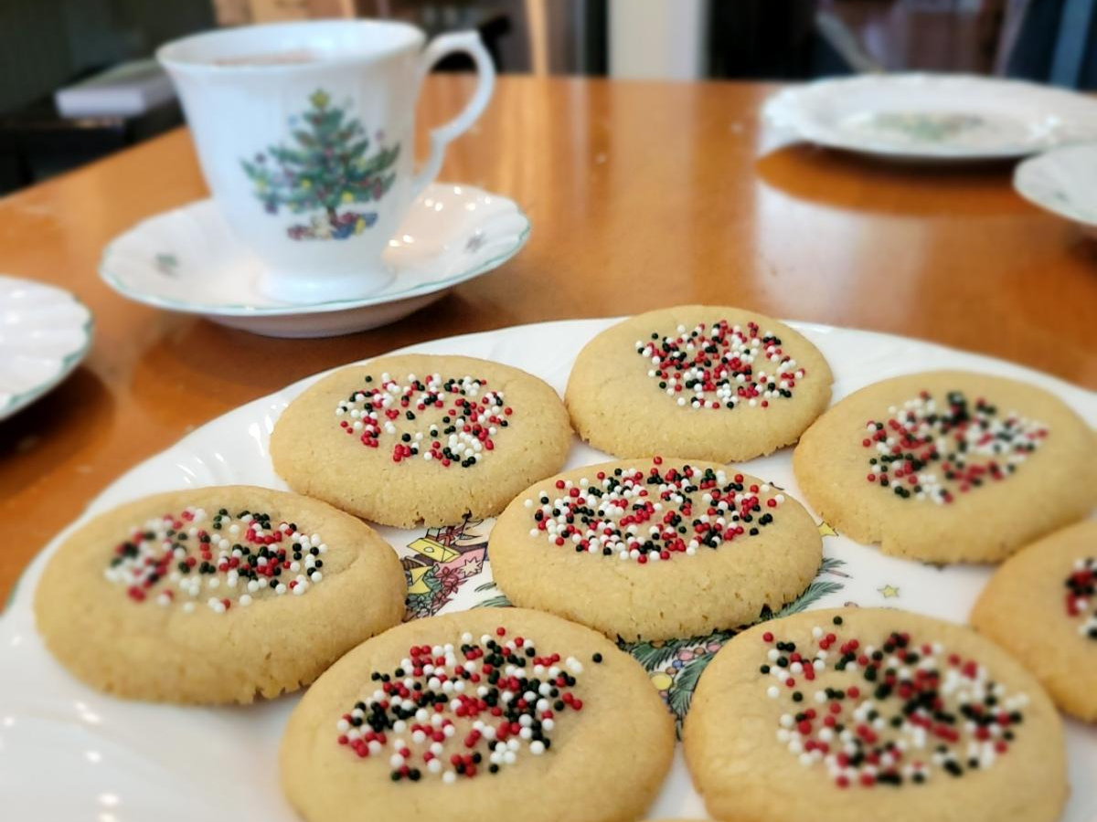 I wanted this tea time to be very Christmas-y and festive. I baked a recipe for Brown Butter Sugar Cookies with holiday sprinkles on top, heated up some hot chocolate, and served everything on our Christmas morning dishes (luckily we keep them in the kitchen year round so they aren’t so hard to find).